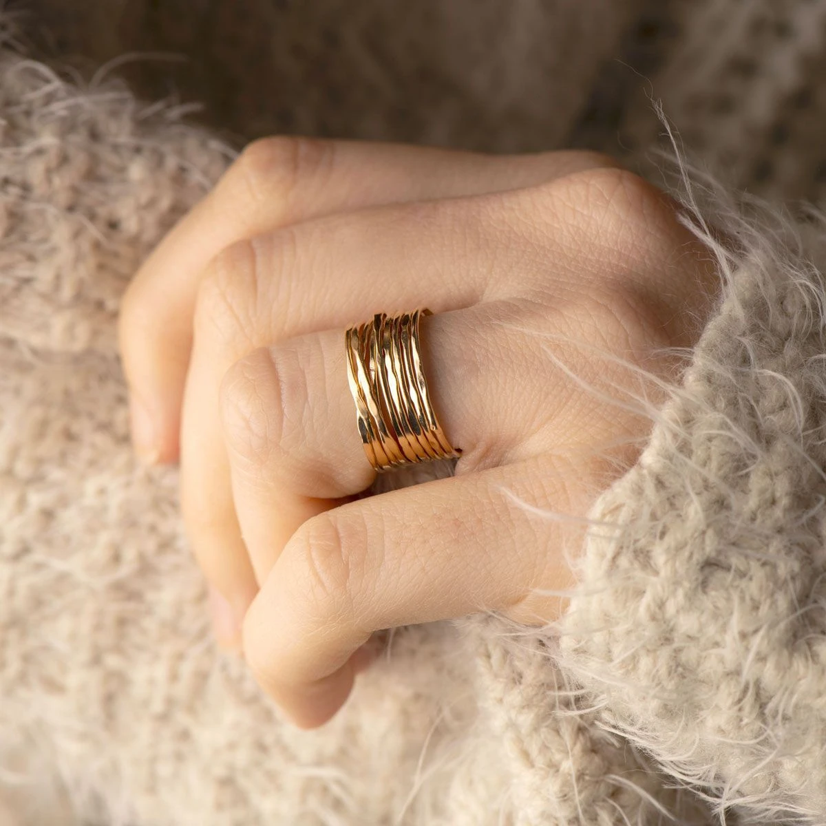 Cette création Atelier de Famille est irrésistible ! Composé de 8 anneaux en plaqué or 3 microns, ce bijou décuple l’éclat de son métal précieux grâce à son aspect légèrement frappé. De plus, ses anneaux ont été travaillés de manière artisanale.