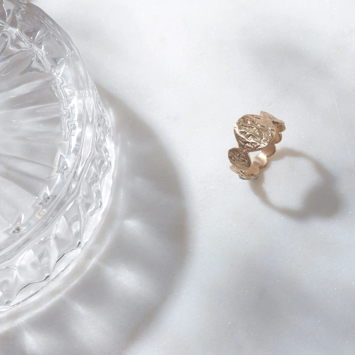 La bague Pompeï est en plaqué Or 3 microns ; composée de 11 « pépites » de tailles différentes. La pépite centrale mesure 1.1 cm.
