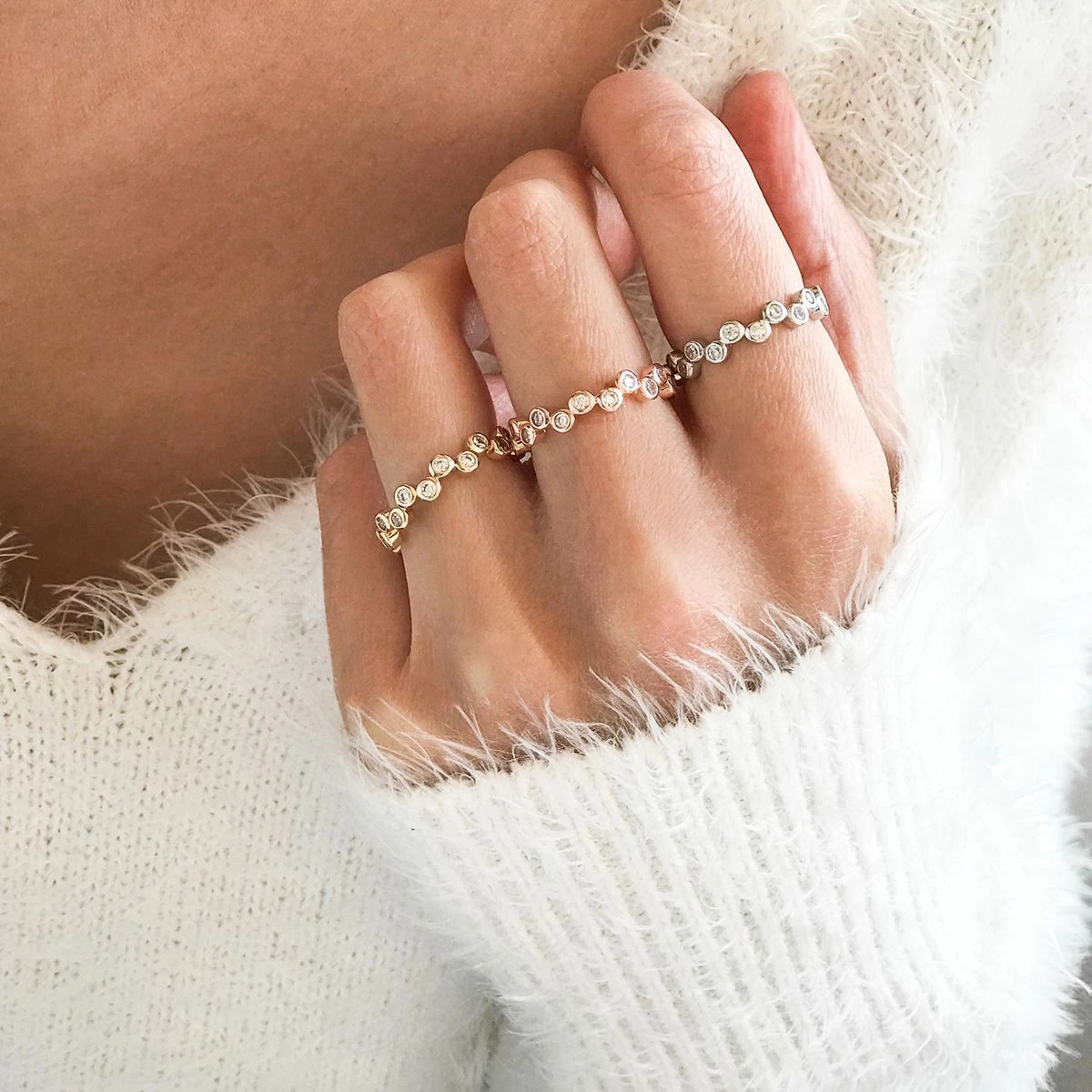 Portées seules, par 2 ou par 3, les bagues reflètent la personnalité. Minimaliste, mais parée d’une infinie élégance, la bague strassée habille le doigt avec finesse et style.