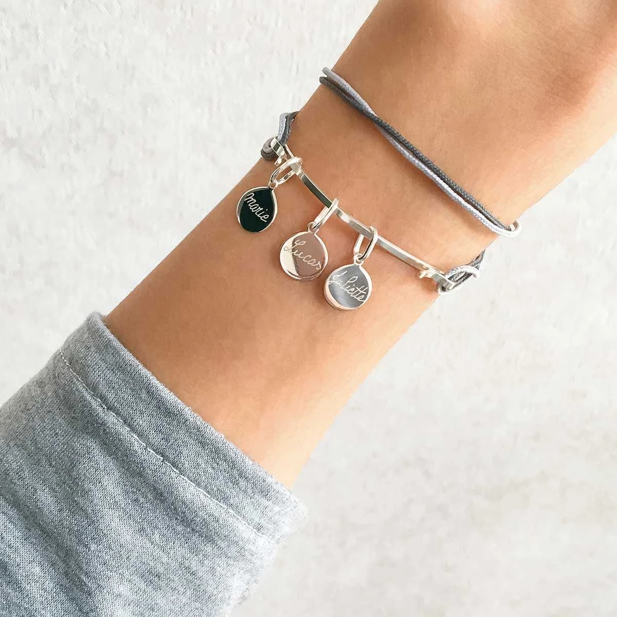 Le bracelet est fabriqué en France. Il est composé d’une barrette demi-jonc plat®, 3 à 6 mini breloques constitue le cadeau parfait pour un événement particulier ou pour faire plaisir.