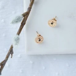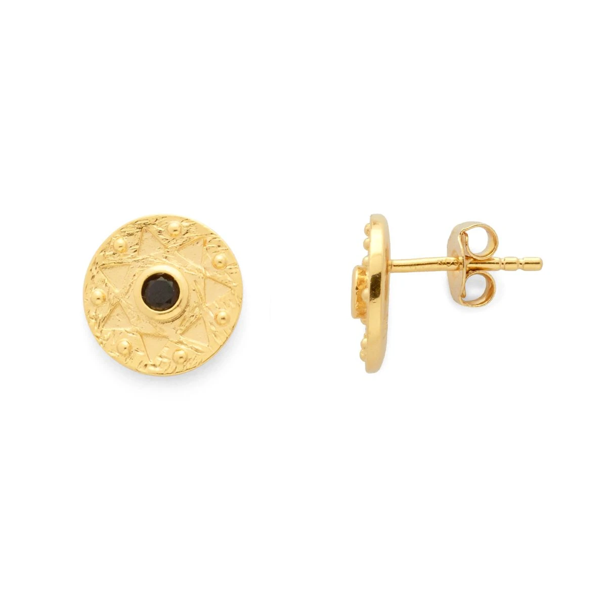 Dans l’air du temps, ces boucles d’oreilles sont en plaqué Or 3 microns; le centre est émaillé noir.