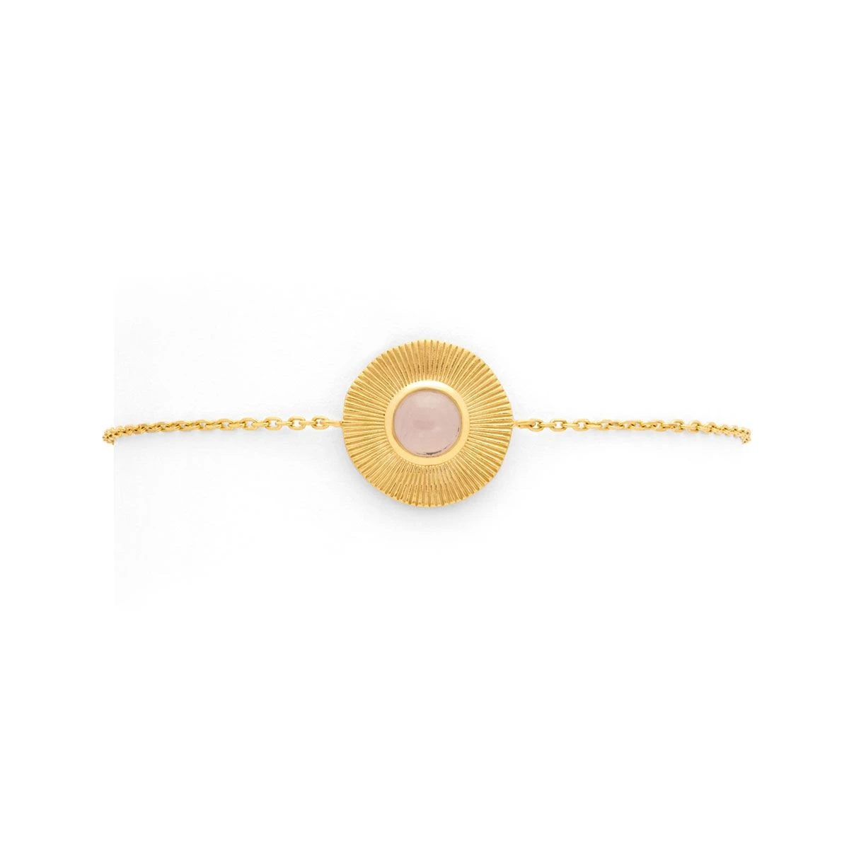 Discret et élégant, ce bracelet chaîne en plaqué or 3 microns agrémente sa chaîne d’une fine pierre en quartz rose. Déposée au centre d’un médaillon lumineux qui semble représenter un soleil, cette pierre fine délicate symbolise l’amour inconditionnel. Ajoutez une gravure au dos de ce médaillon et vous offrirez un présent unique, empli de tendresse et d’affection. Soigneusement gravé à la main, votre message s’offrira un magnifique écrin ! Avec ce bijou personnalisé, vous êtes sûr de faire plaisir à celle que vous aimez.