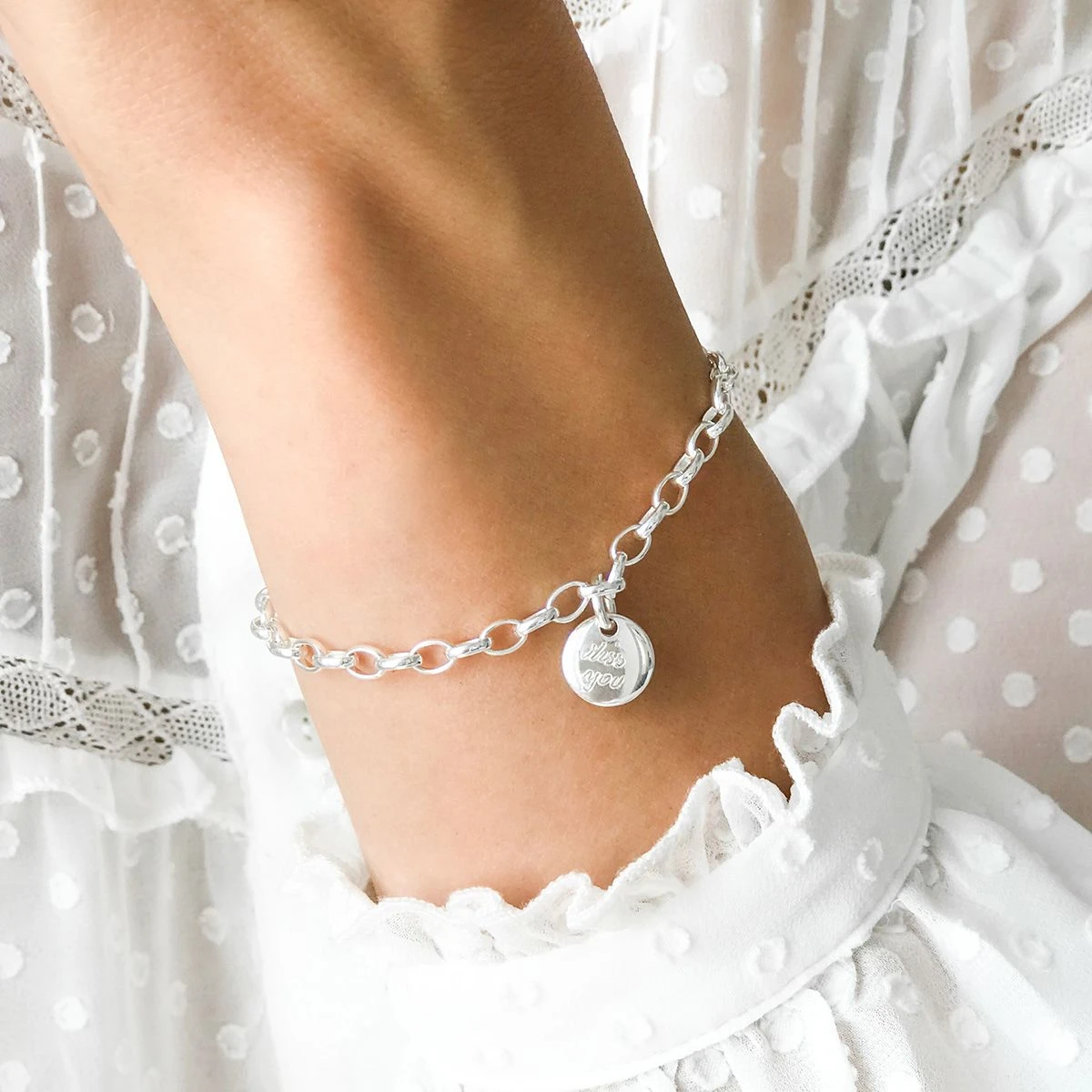 Composé de petits maillons, ce bracelet chaîne en argent massif peut accueillir jusqu’à 6 mini breloques. Trèfle, étoile, cœur, croix ou silhouettes d’enfants, choisissez selon vos goûts et vos envies. Pour le côté ludique, ce bracelet original vous propose de graver chacune de ses breloques sur ses deux faces. Avec un peu d’imagination, vous parviendrez à surprendre un être cher en symbolisant toutes les facettes de sa personnalité. Faites parler votre cœur à travers les gravures pour offrir un présent empreint d’amour et d’affection.