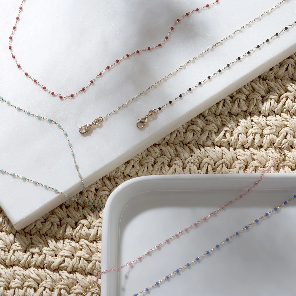 Cylindriques et délicates, les perles de Miyuki sont disponibles en différentes teintes : selon vos préférences, optez pour des perles noires, blanches vert d’eau roses rouges ou bleues.