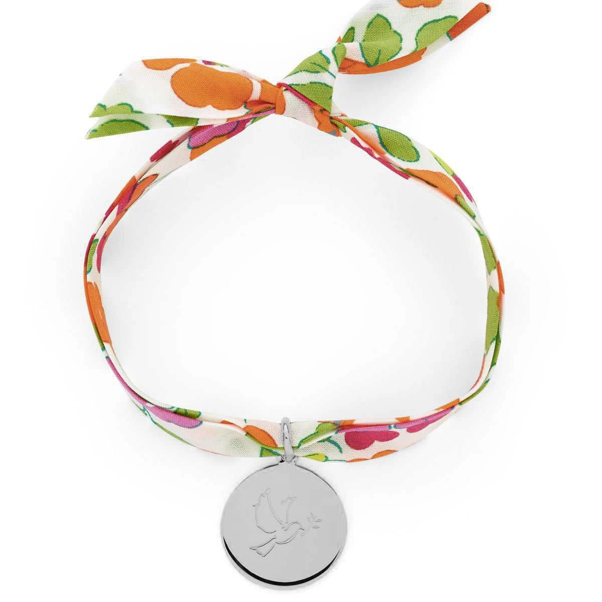 Le bracelet petite médaille en plaqué or Colombe se compose d’un ruban coloré agrémenté d’une médaille ronde. Motifs floraux, zébrés, vichy, pois, couleurs vives ou discrètes, vous bénéficierez d’un large choix de rubans Liberty. Ainsi, vous serez sûr de faire plaisir ! Quant au médaillon en plaqué or 3 microns, il se pare d’une élégante colombe. Symbole religieux, cet oiseau majestueux fait de ce bracelet en plaqué or un présent idéal pour un baptême. Au verso de la médaille, nous graverons soigneusement les inscriptions de votre choix. Cette gravure façon joaillier donnera tout son sens à ce bijou unique qui se fera l’écrin d’un joli message d’amour.