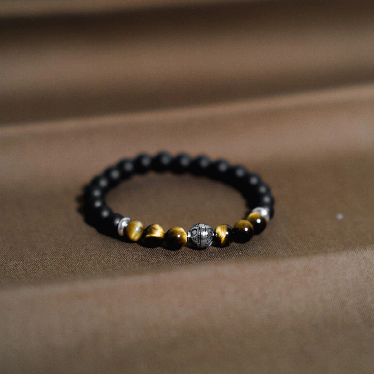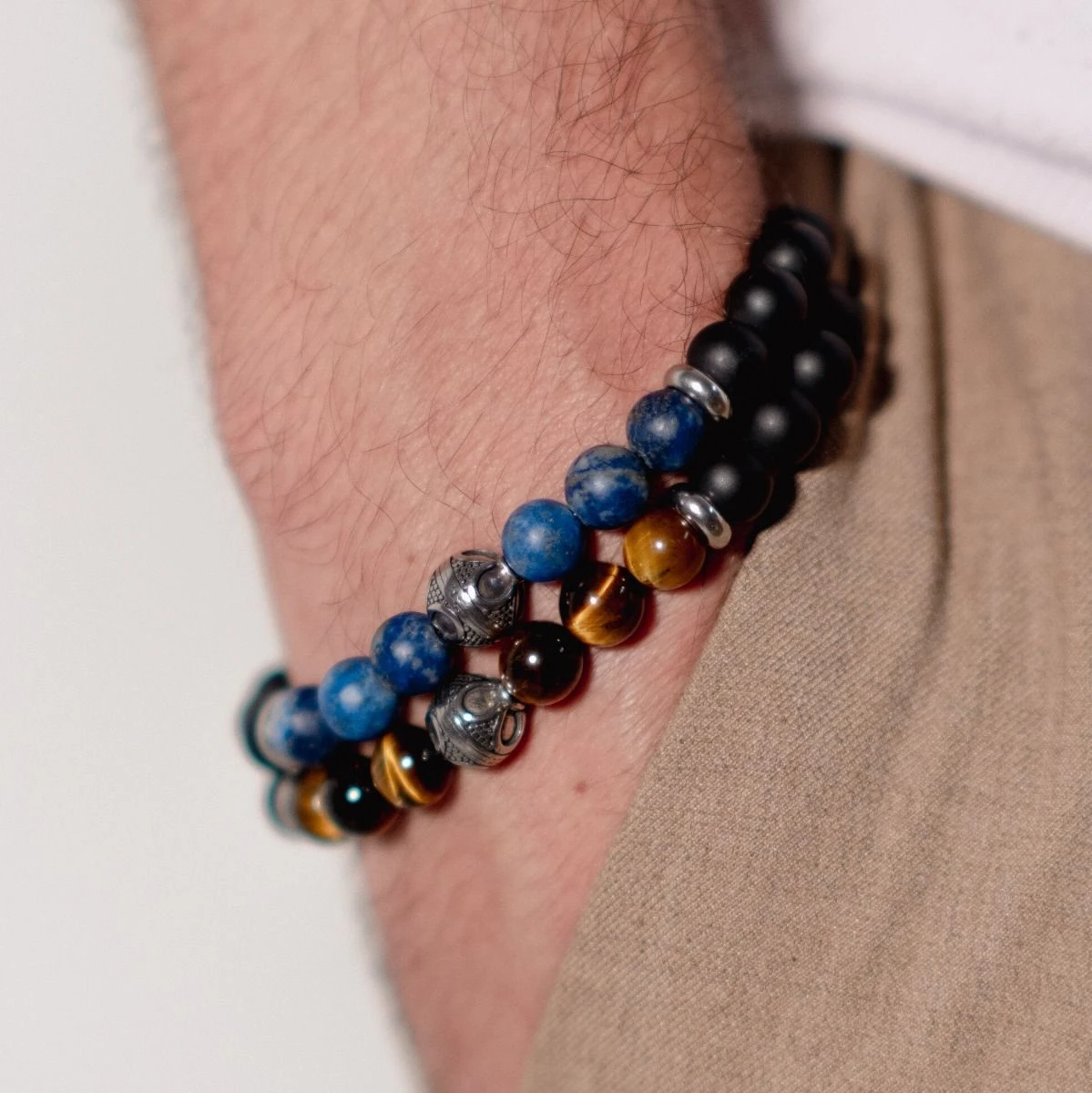 Pour offrir cette dimension symbolique, le bracelet Élément accompagne ses pierres noires de pierres naturelles colorées. En fonction de leur nature et leur teinte, elles représentent un des quatre éléments. La pierre Lapis Lazuli de couleur bleue, par exemple, représente l’eau tandis que la pierre œil de tigre de couleur marron évoque le feu. La couleur marron oeil de taureau évoque la terre.