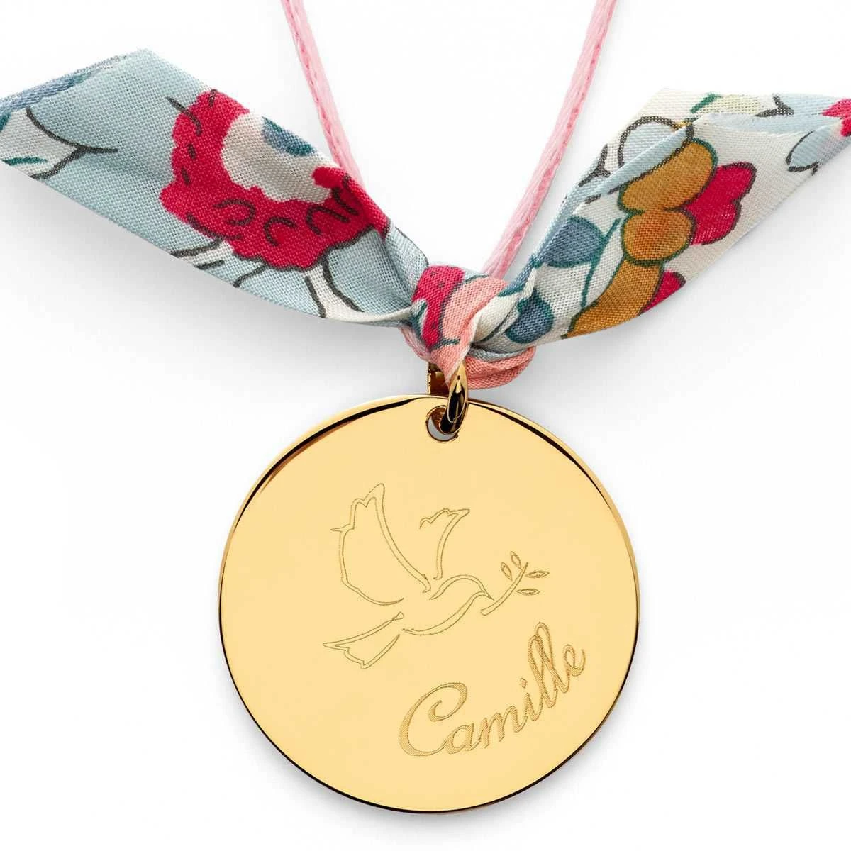 Sobre et raffinée, la Médaille Colombe et prénom sur cordon à personnaliser accompagnera avec discrétion et élégance son heureux destinataire au quotidien. Pour une touche printanière, il est possible de l’agrémenter d’un petit nœud Liberty au choix.