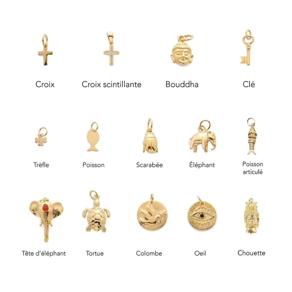 Clé, colombe, croix, éléphant, tortue et bien d’autres idées vous permettront de faire de ce bijou un cadeau symbolique à offrir à une personne qui compte pour vous.