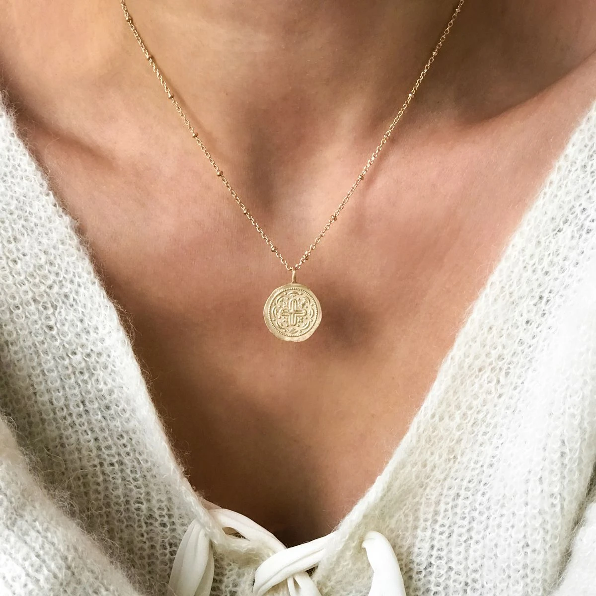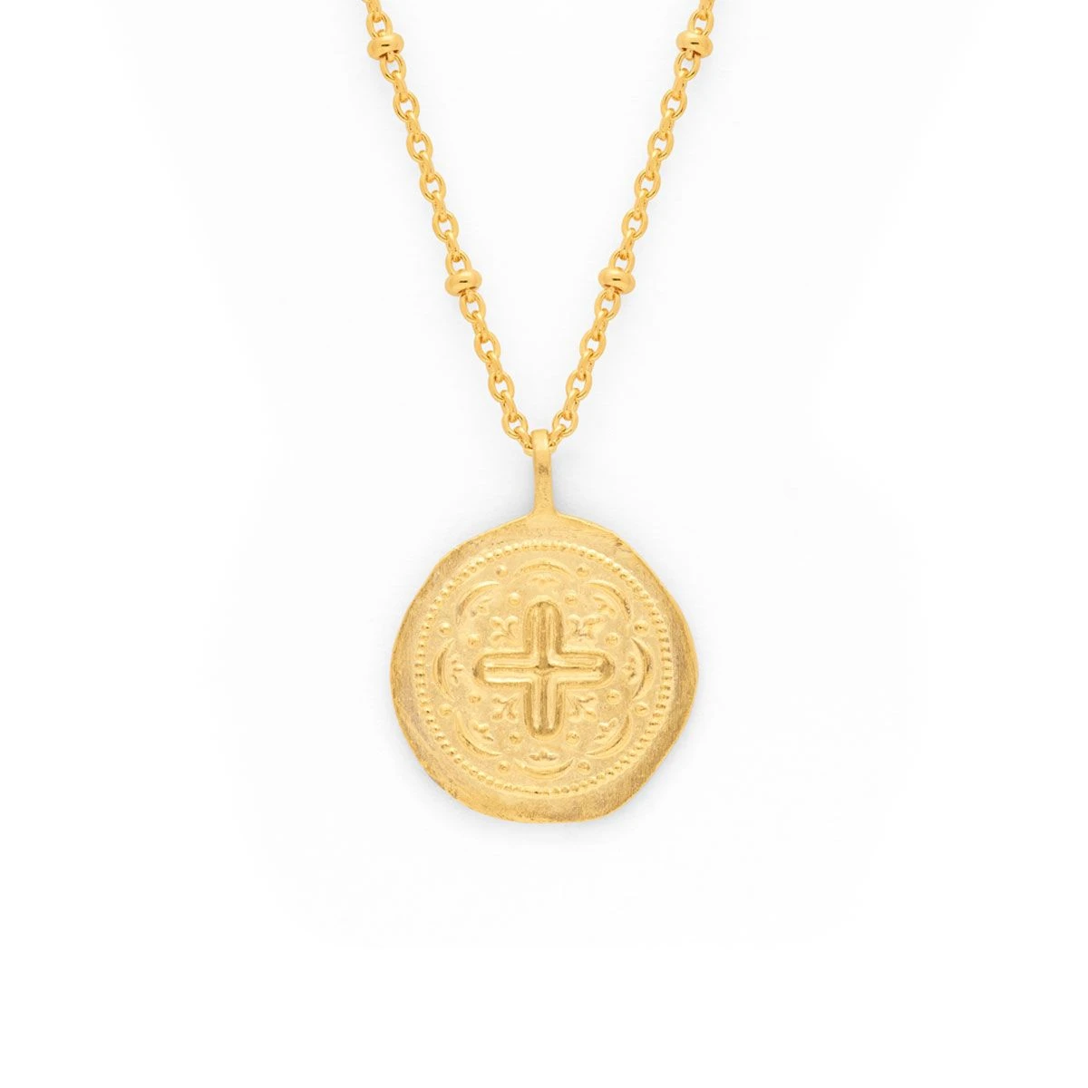 Montée sur une sublime chaîne perlée en plaqué or 3 microns, notre nouvelle médaille croix byzantine se pare d’une jolie finition mate pour allier brillamment raffinement et authenticité. Légèrement irrégulière, elle offre une symbolique forte à ce bijou. En effet, la croix byzantine représente les 4 points cardinaux de la terre et les quatre éléments essentiels : la terre, le feu, l’air et l’eau.