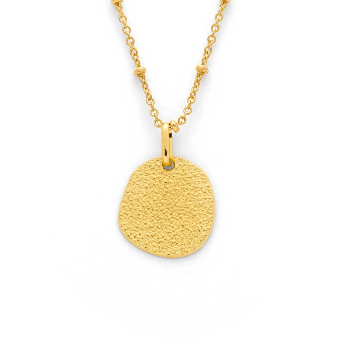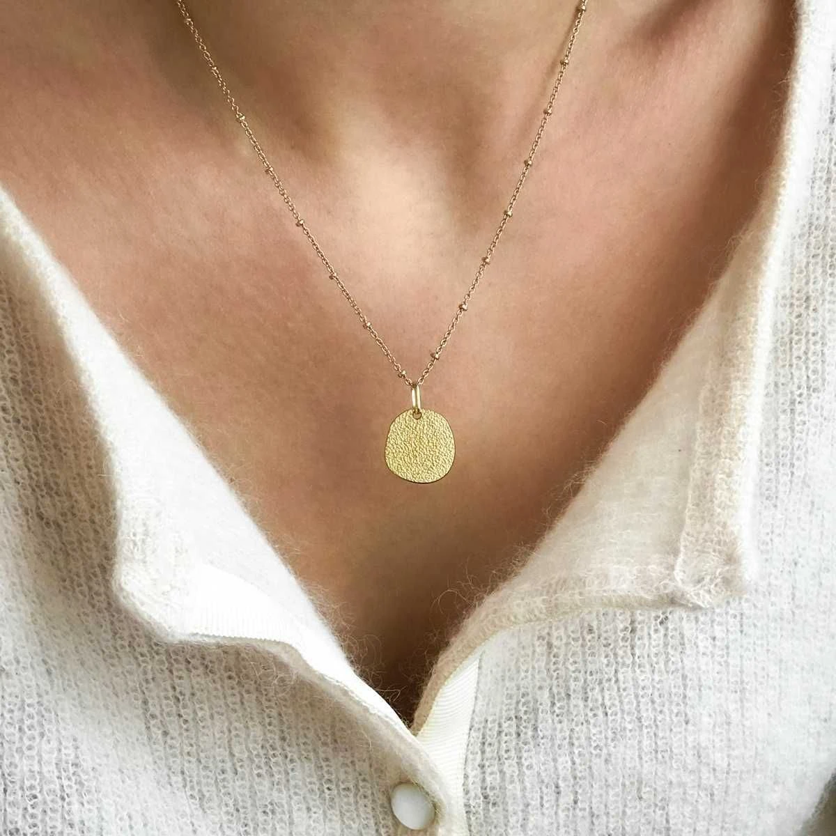 Cette nouvelle médaille est un peu plus artisanale : aspect irisé et irrégulier, un or mat qui met en lumière sa fabrication très spéciale. Elle est associée à notre nouvelle chaîne perlée.