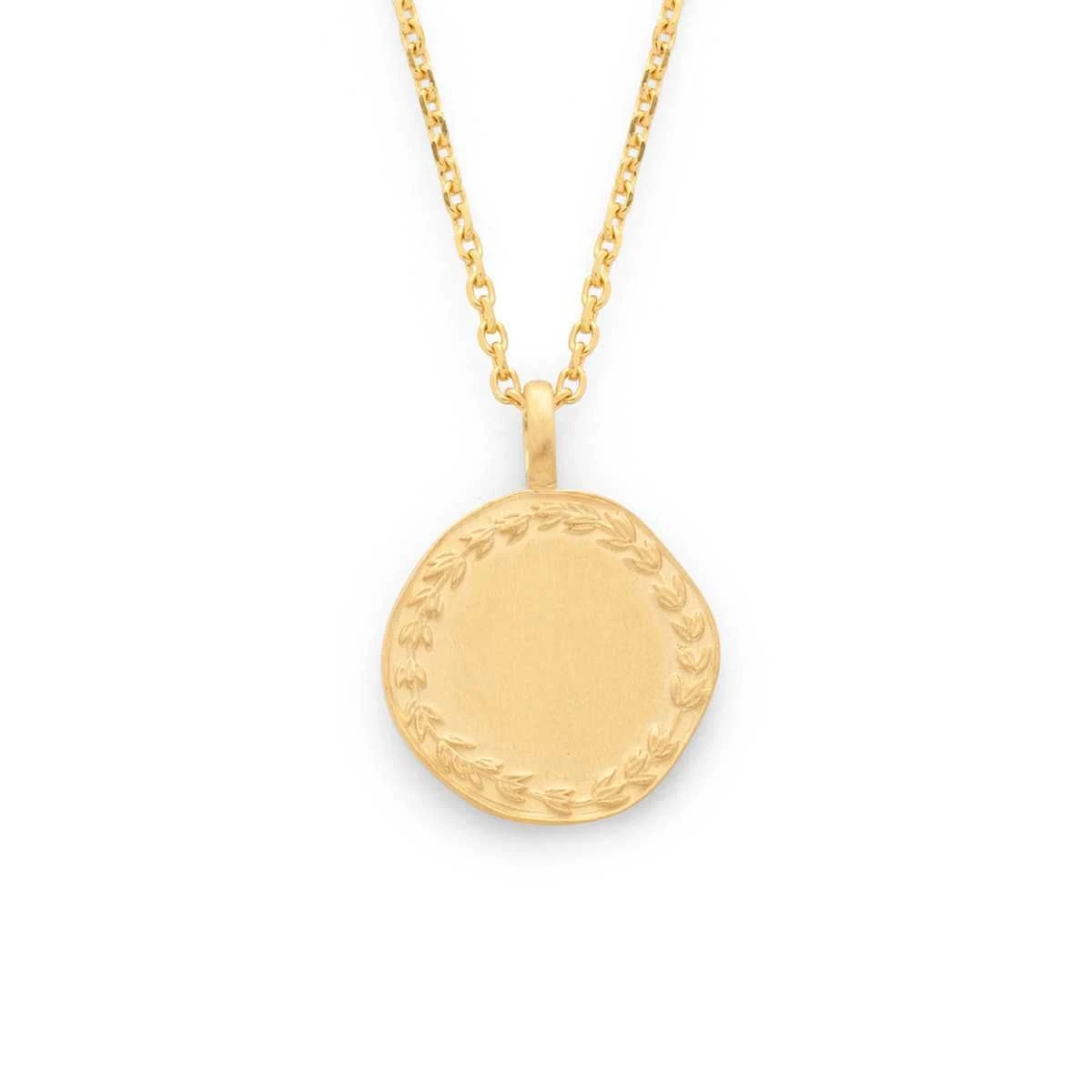 Cette médaille est ornée d’une liane de laurier sur le contour. Elle est portée sur une chaîne en maille forçat dont vous pourrez choisir la longueur.