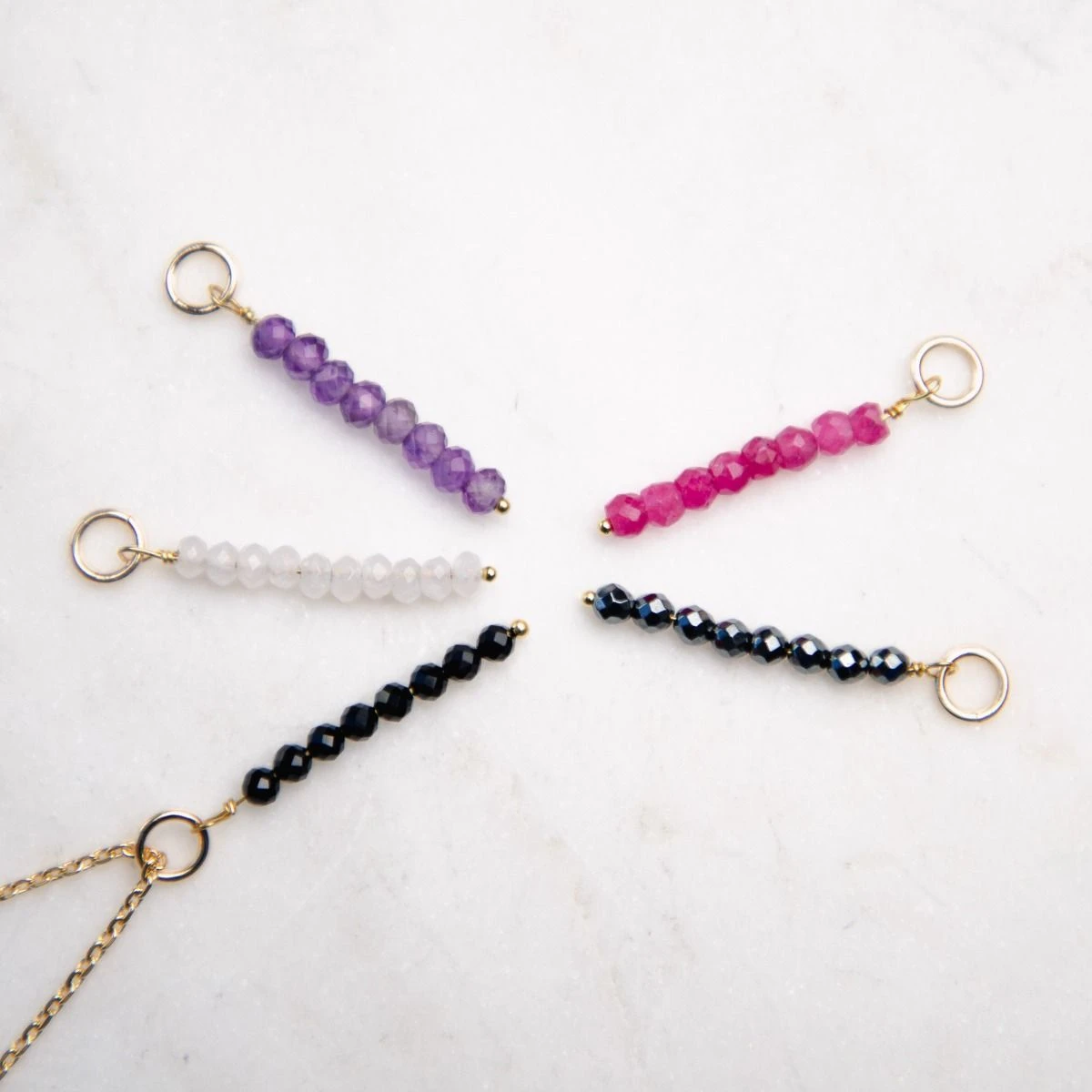 Spinelle noire, hématite, pierre de lune blanche, calcédoine rose ou améthyste, cinq pierres pour cinq coloris.