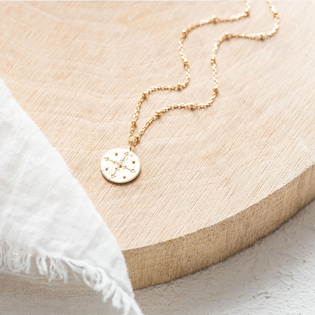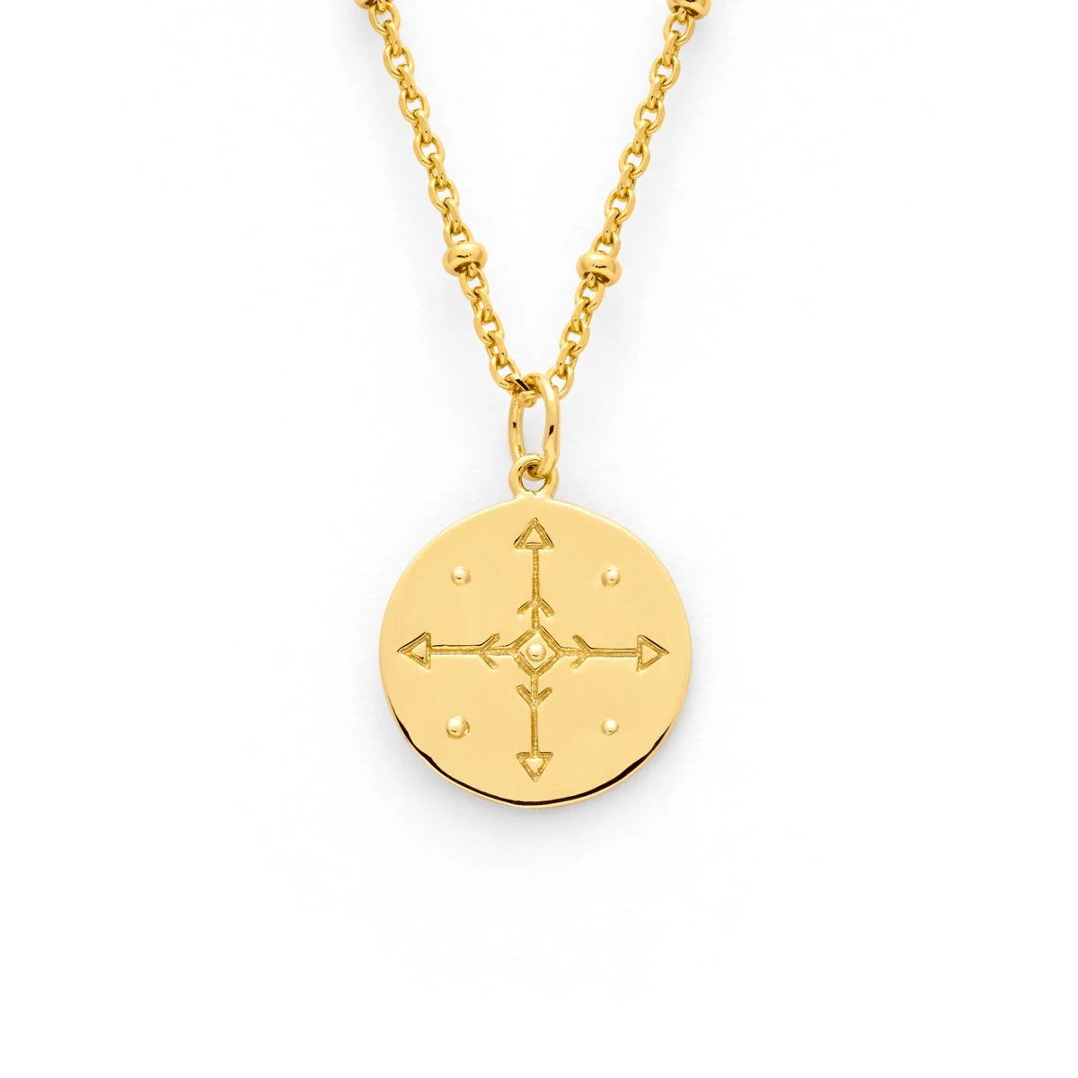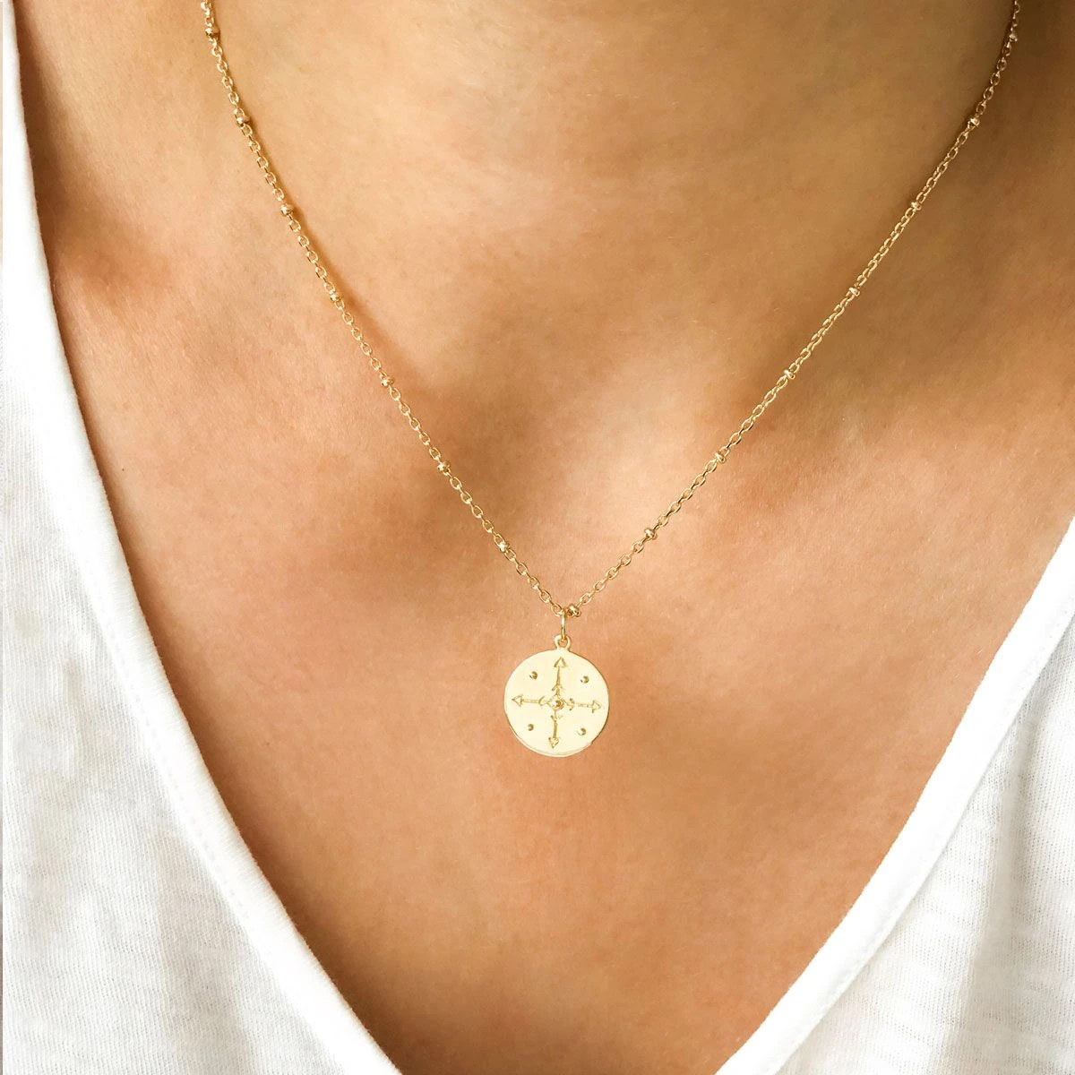 La médaille du collier est montée sur une jolie chaîne en maille forçat perlée. D’un diamètre de 1,5 cm, elle accueille sur son recto une superbe Rose des Vents. Pointant symboliquement vers les 4 points cardinaux, cette figure représente la liberté et l’orientation.