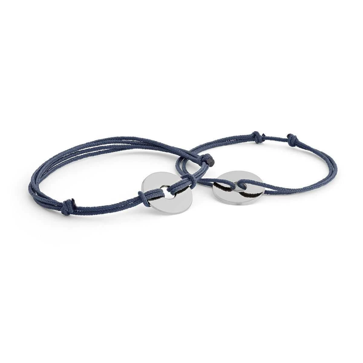 Ces deux bracelets cordon personnalisé peuvent symboliser un lien d’amour ou d’amitié. Tous deux agrémentés d’un petit médaillon en forme de cible, ils représenteront le lien puissant qui vous unit à un être cher. Il pourra s’agir de votre moitié, de votre frère ou sœur, de votre meilleur ami ou même d’un parent. Quels que soient les sentiments qui vous unissent, ces bracelets cible duo exprimeront toute votre affection avec une grande sincérité. Pour offrir un présent chargé d’émotion, nous vous proposons de graver le médaillon en argent massif de chaque bracelet. À vous d’inscrire vos sentiments les plus profonds pour faire de ces bijoux de véritables symboles de votre attachement. Vous serez également libre de choisir la couleur des cordons. Bien sûr, la gravure et la couleur du lien peuvent être différentes d’un bracelet à l’autre.