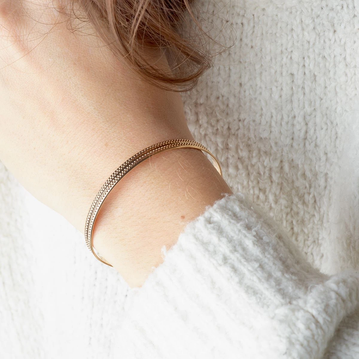 Ce Jonc ruban double perles fait sensation auprès de la gent féminine pour ses deux lignes raffinées de petites perles. Il se porte seul ou avec d’autres pièces pour un look dans l’air du temps.