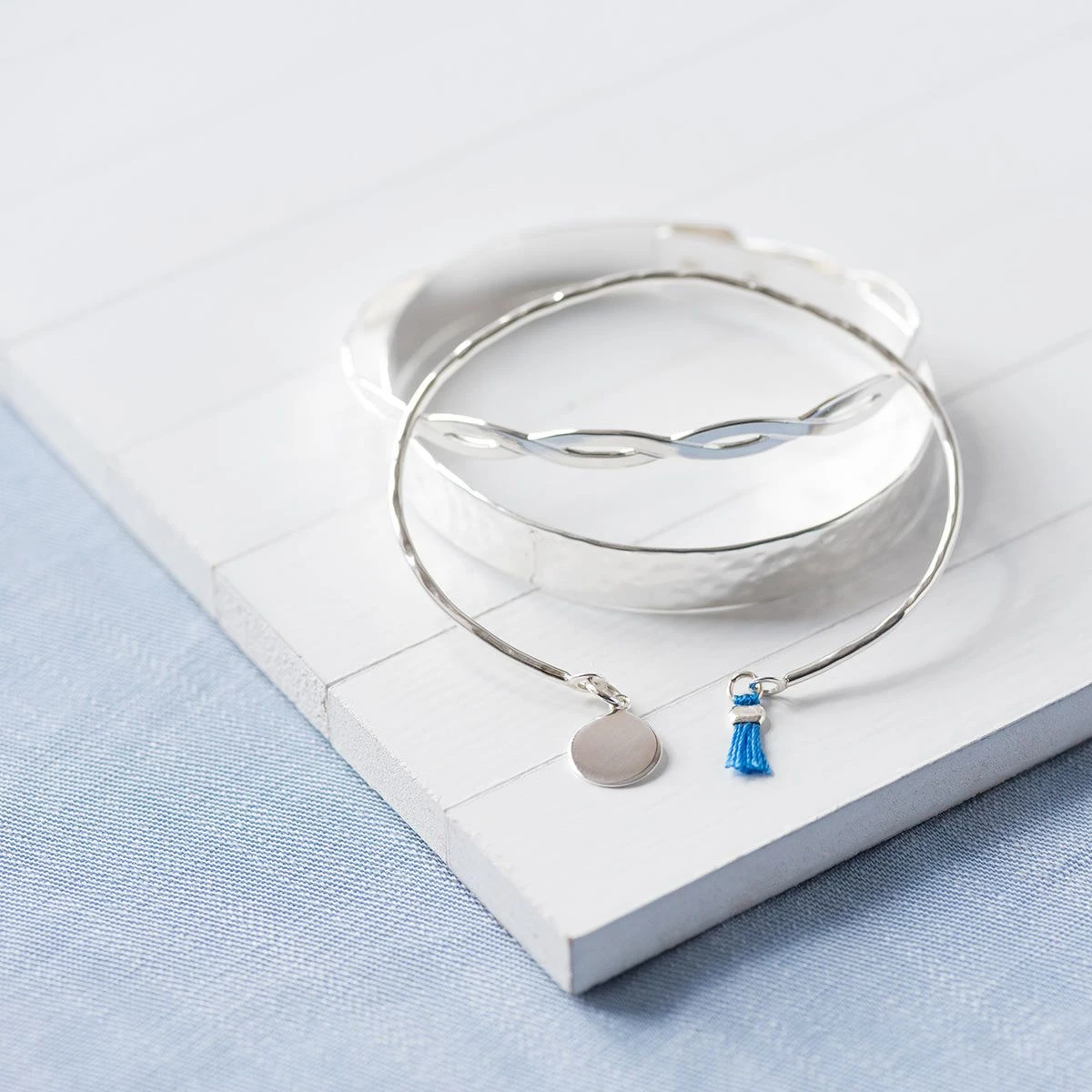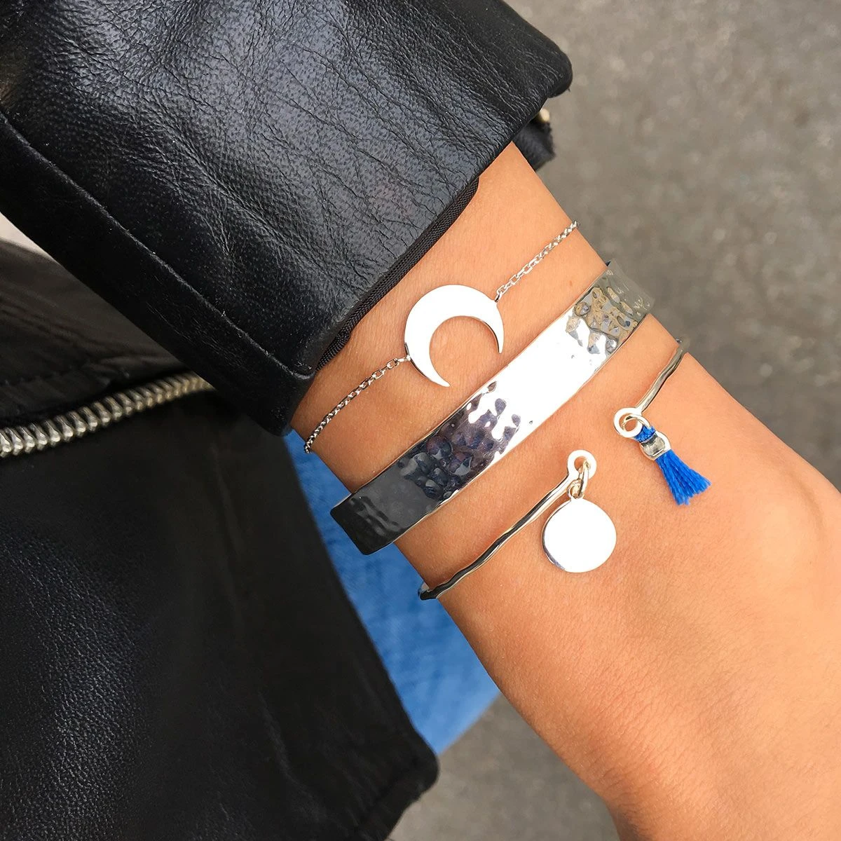 En Argent massif ce Jonc fin martelé mini breloque et mini pompon vous accompagnera avec finesse et élégance au quotidien. Nous vous proposons de personnaliser la breloque pour en faire une pièce unique et de choisir la couleur du pompon.