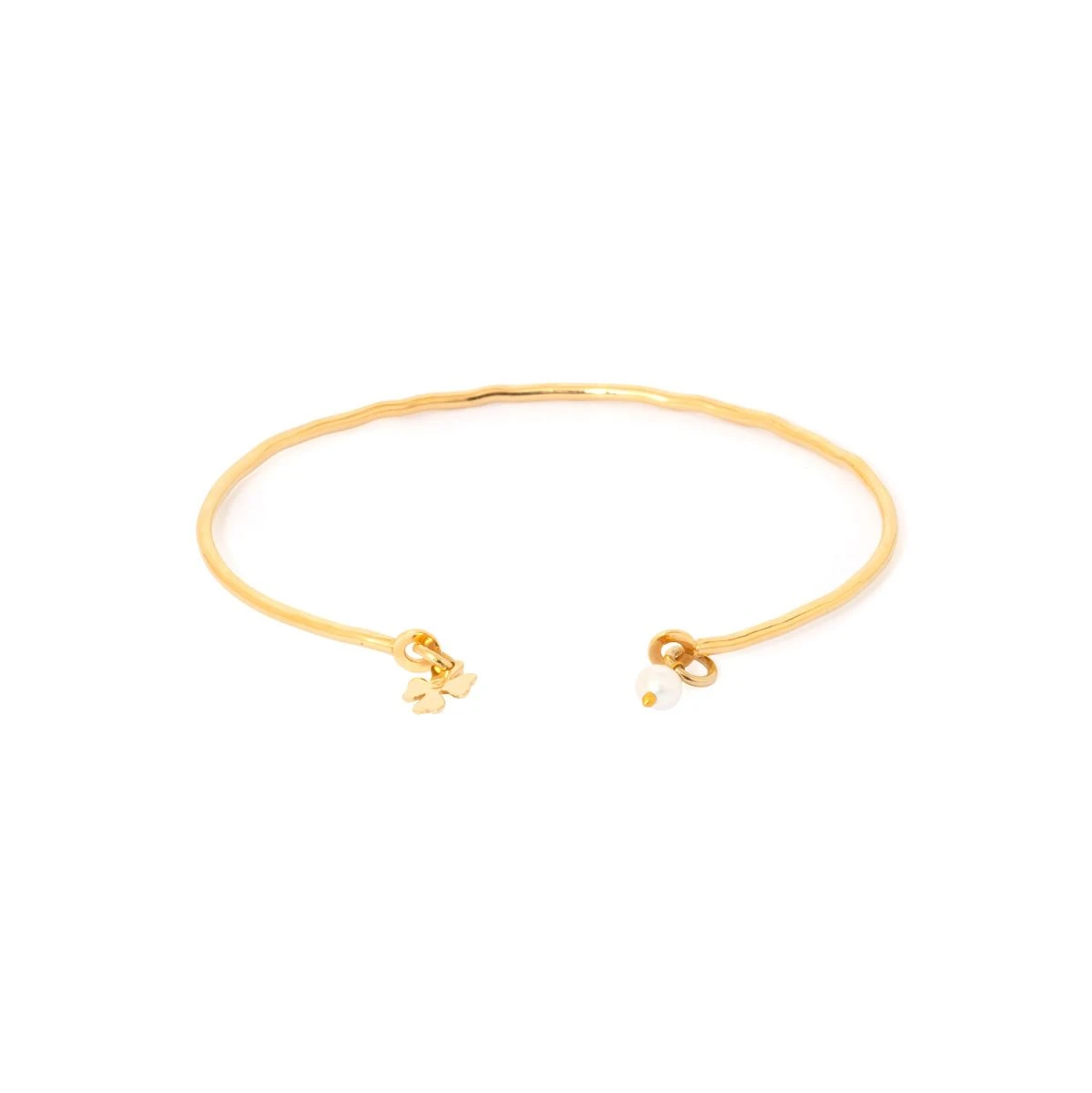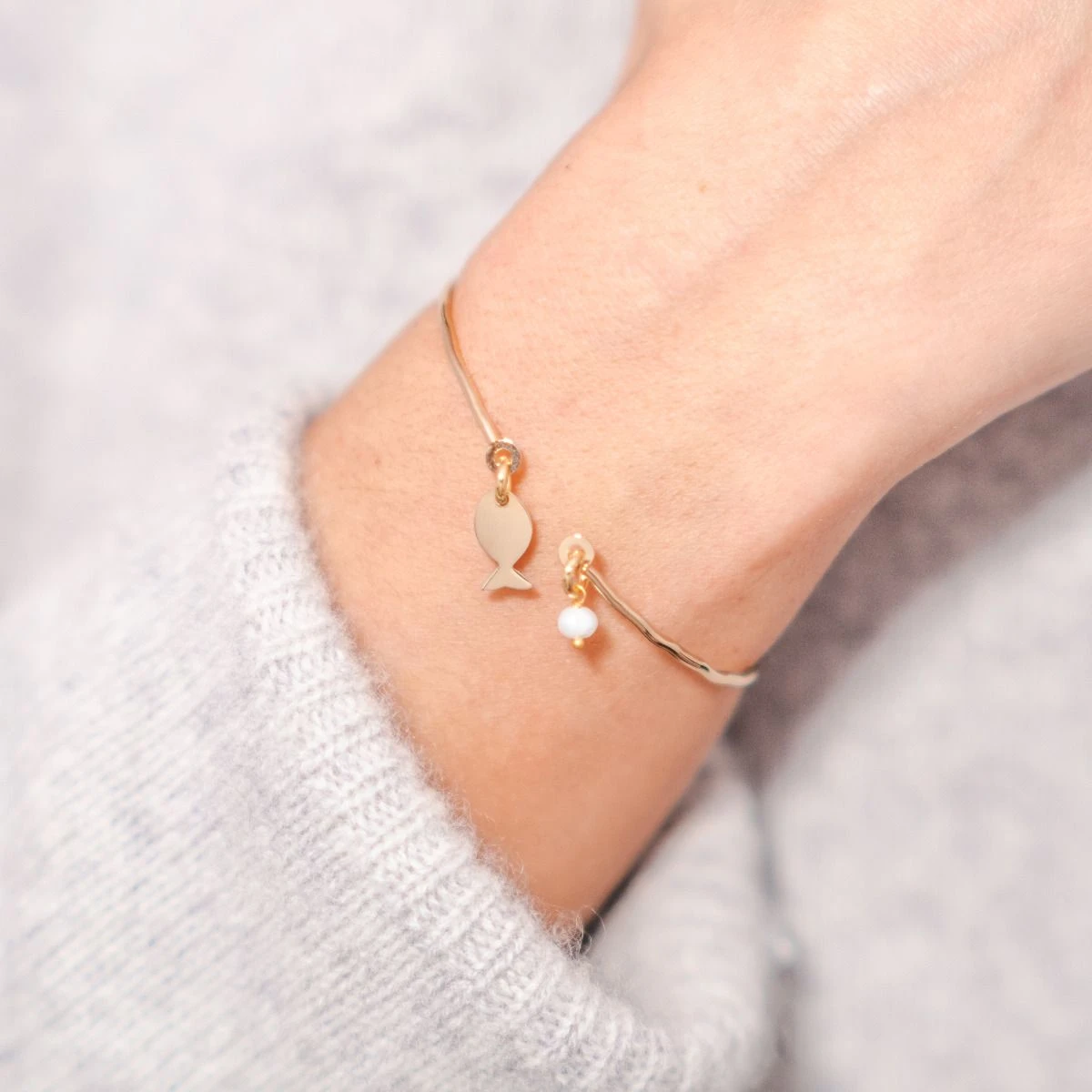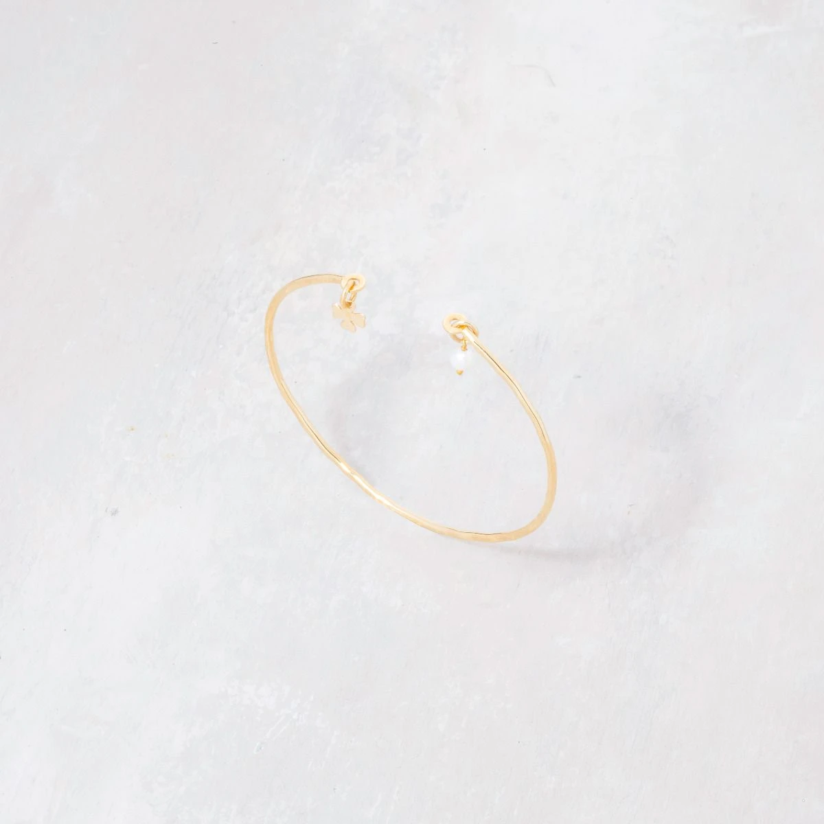 Résolument élégant, ce jonc fin martelé en plaqué or 3 microns est issu de notre collection « Nacre ». Personnalisable, il vous invite à faire de lui une pièce unique. Son bracelet fin et martelé habillera votre poignet de toute sa douceur et son éclat. Porté ouvert, ce jonc orne chacune de ses extrémités d’une mini breloque. D’un côté, la nacre symbolise la pureté et la tendresse. De l’autre, nous vous proposons d’ajouter un mini trèfle, un mini poisson ou une mini croix scintillante. À vous de faire de ce jonc original un bijou unique qui vous ressemble !