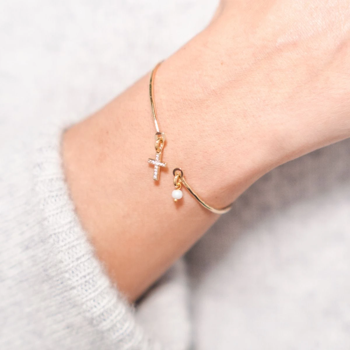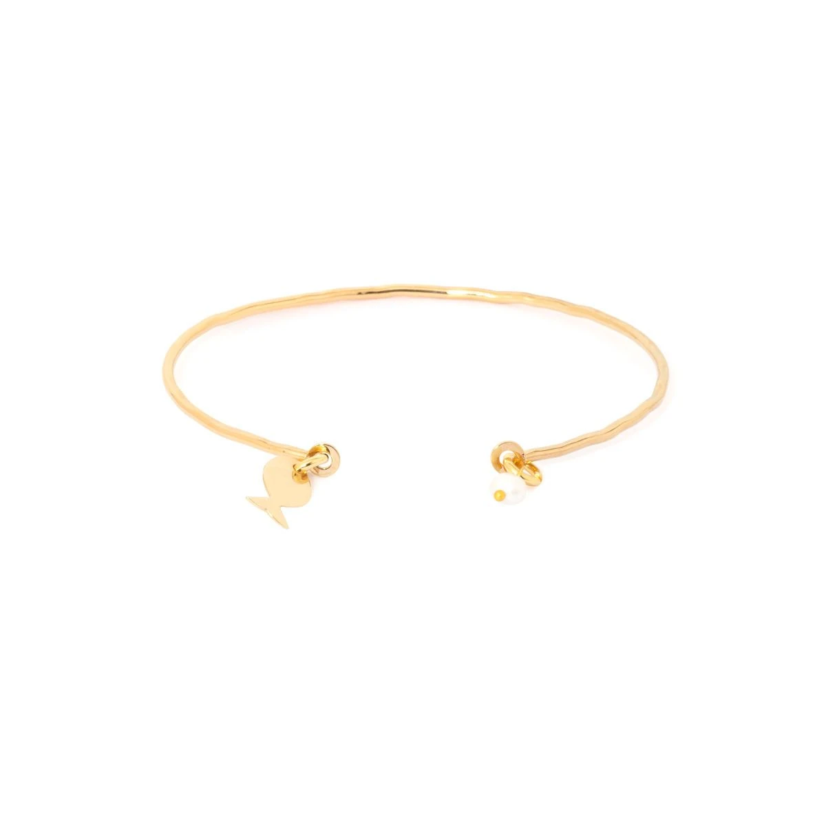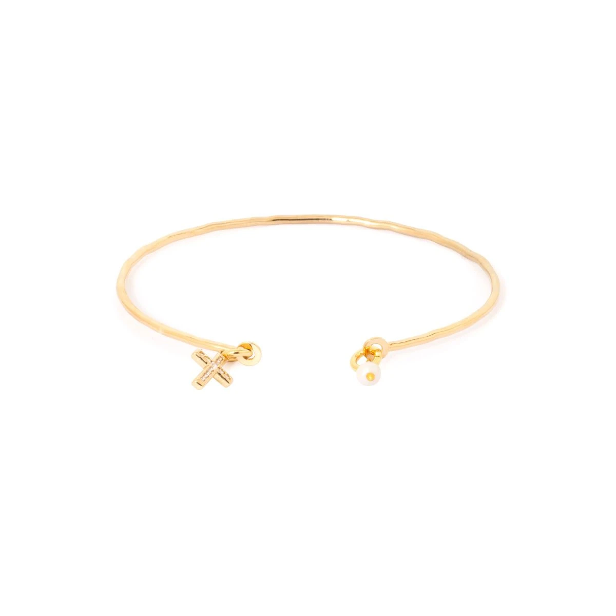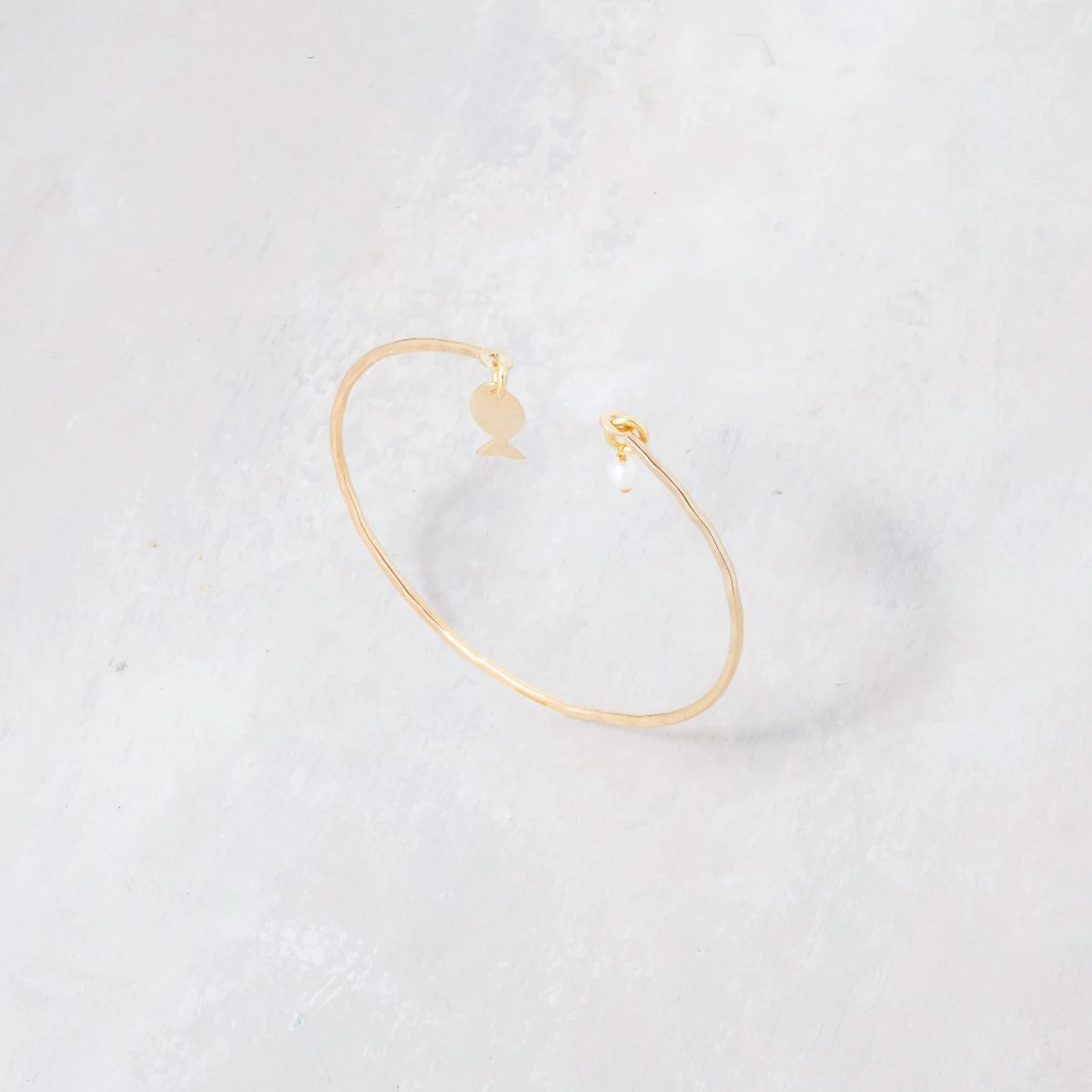 Résolument élégant, ce jonc fin martelé en plaqué or 3 microns est issu de notre collection « Nacre ». Personnalisable, il vous invite à faire de lui une pièce unique. Son bracelet fin et martelé habillera votre poignet de toute sa douceur et son éclat. Porté ouvert, ce jonc orne chacune de ses extrémités d’une mini breloque. D’un côté, la nacre symbolise la pureté et la tendresse. De l’autre, nous vous proposons d’ajouter un mini trèfle, un mini poisson ou une mini croix scintillante. À vous de faire de ce jonc original un bijou unique qui vous ressemble !