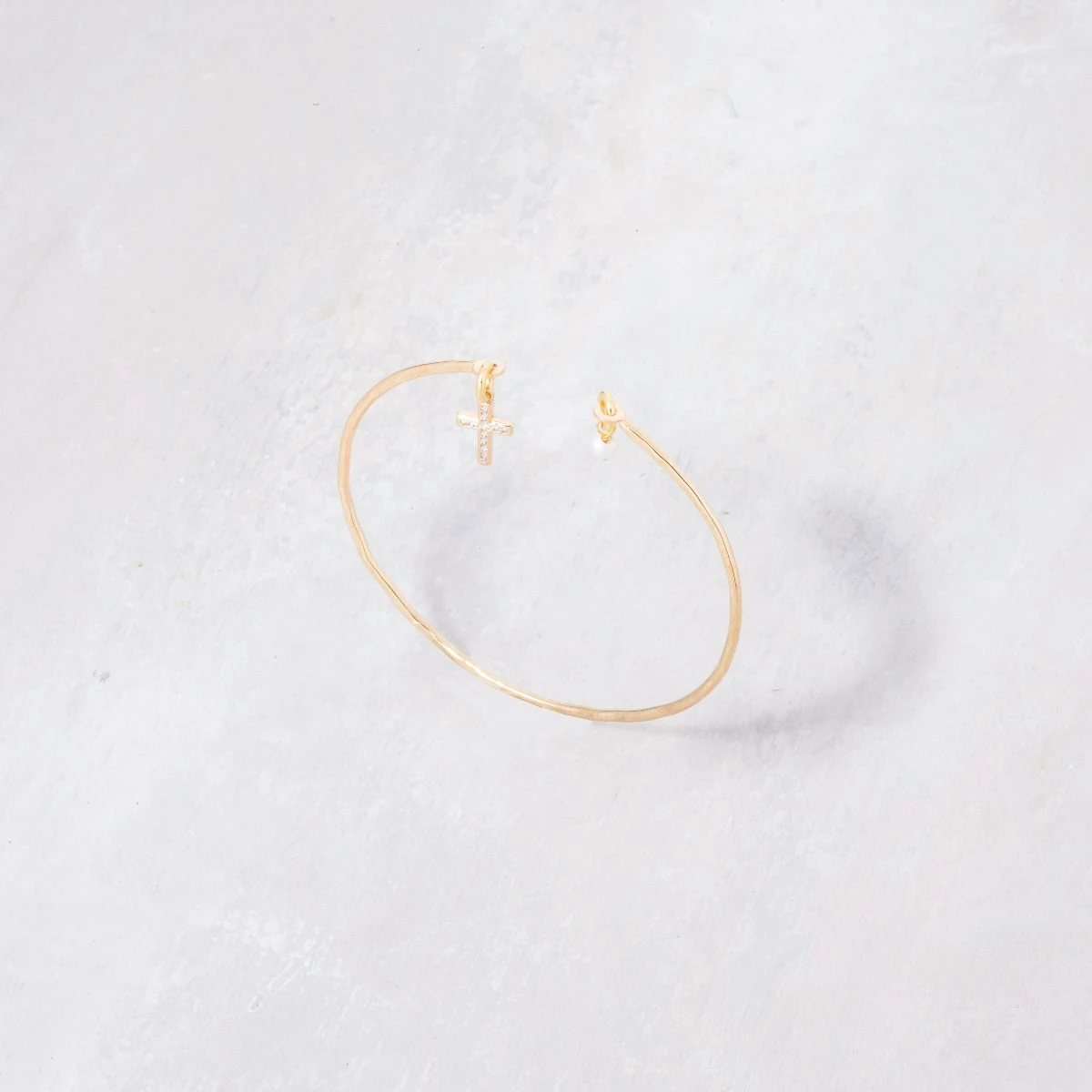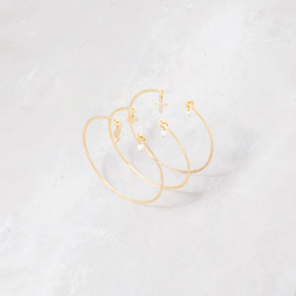 Le diamètre du jonc fin martelé nacre et mini grigri mesure 6 cm. Les mini breloques trèfle, croix et poisson mesurent respectivement 0.6 cm, 1.1 cm et 1.2 cm.