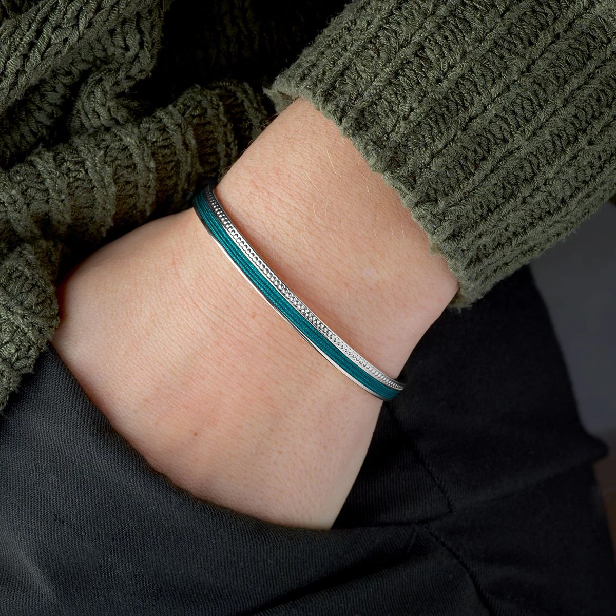 Composez ce bracelet jonc selon vos désirs pour surprendre avec goût et tendresse. En plaqué or 3 microns, en plaqué or rose ou en argent massif, ce bijou sublime le poignet de son ruban orné de petites perles et de deux liens en coton. Une multitude de couleurs vous est proposée pour assortir ces derniers à votre style. Faites-en un présent symbolique en gravant son verso des inscriptions de votre choix. Atelier de Famille réalisera cette gravure avec soin pour vous permettre d’offrir le plus beau et le plus affectueux des cadeaux.