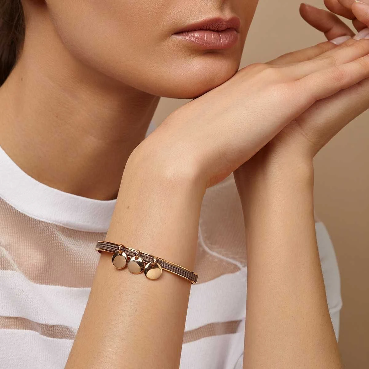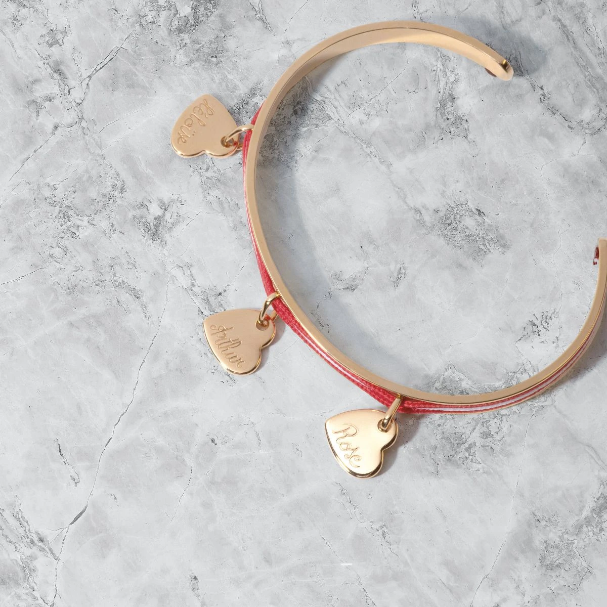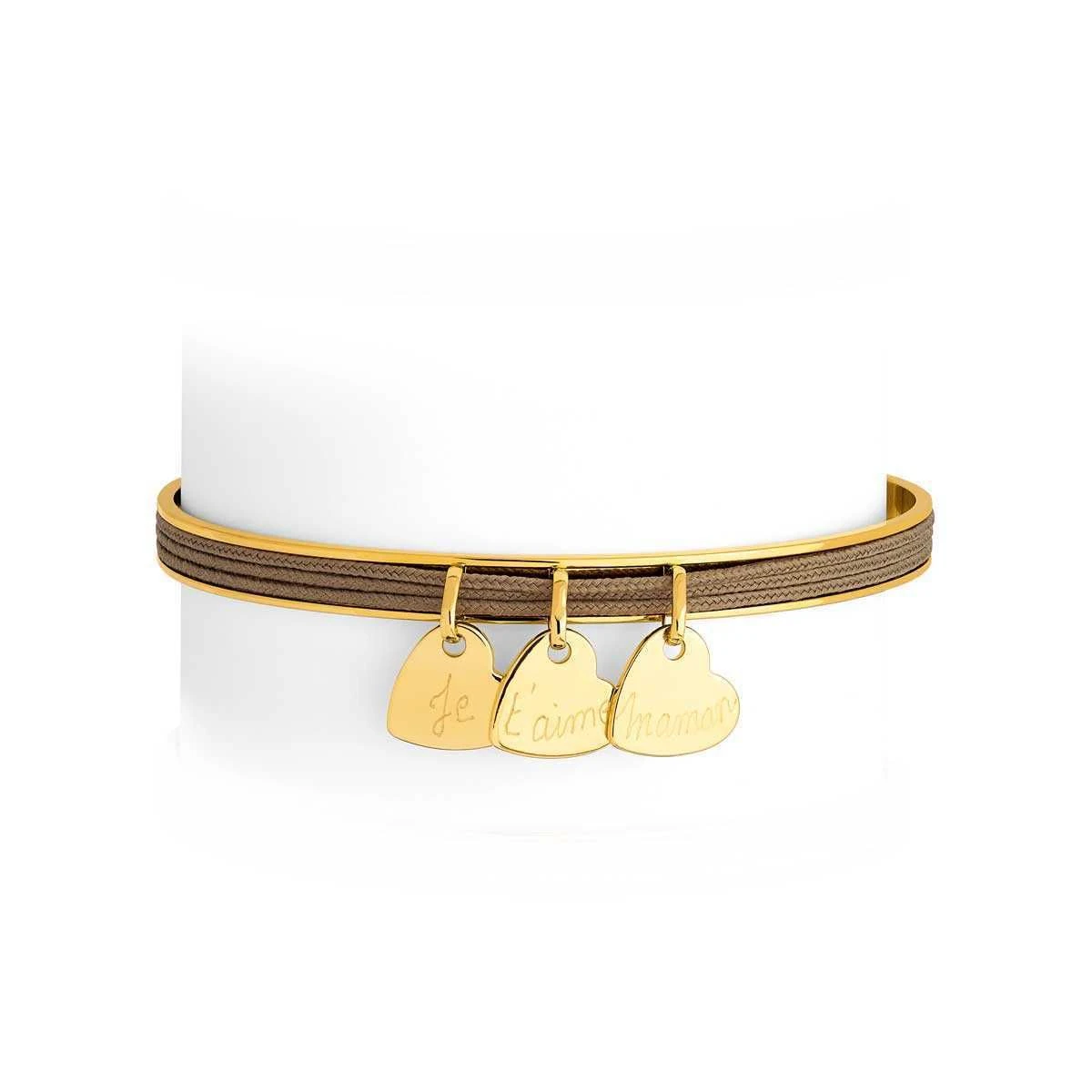 Entièrement personnalisable, ce jonc ruban galon vous offre de multiples possibilités de personnalisation ! En plaqué or 3 microns, il n’attend que vous pour se transformer en un bijou unique qui ne vous quittera plus ! Porté ouvert, ce bracelet vous propose de réaliser une première gravure sur son envers. Puis il vous invite à choisir jusqu’à cinq mini breloques. Atelier de Famille vous offre un large panel de formes pour donner une dimension symbolique à ce bijou unique. Chaque breloque peut être gravée recto verso selon vos désirs. Et pour apporter une touche de fantaisie, à vous de choisir le coloris des trois liens en coton. N’hésitez pas à mélanger les teintes pour composer un bijou unique et débordant d’originalité. Sachez que ce bijou existe aussi en argent massif.