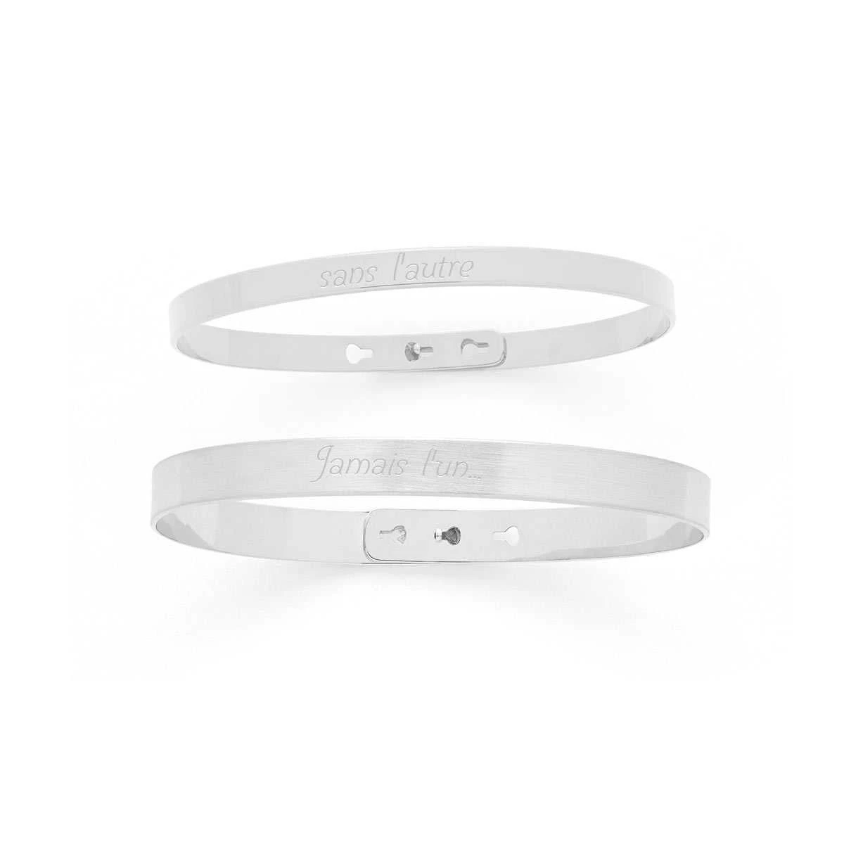 Vous cherchez un cadeau original pour la Saint-Valentin ? Atelier de Famille vous propose le bijou idéal avec ce duo de joncs personnalisables. Sobres et élégants, ces deux bracelets en argent massif habilleront vos poignets de leur charme raffiné. Le jonc femme est également disponible en plaqué or jaune et rose, mais tous deux seront gravés selon vos désirs et avec le plus grand soin dans notre atelier. Profitez-en pour faire de ces bijoux des pièces uniques, véritables symboles du lien d’amour inaltérable qui unit votre couple. La première gravure recouvrira le jonc pour elle et la seconde le bracelet pour lui.
