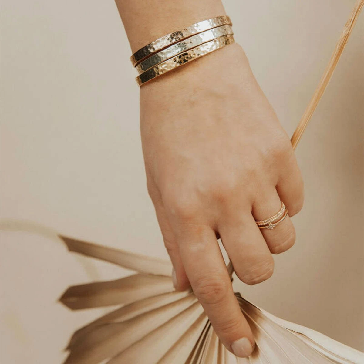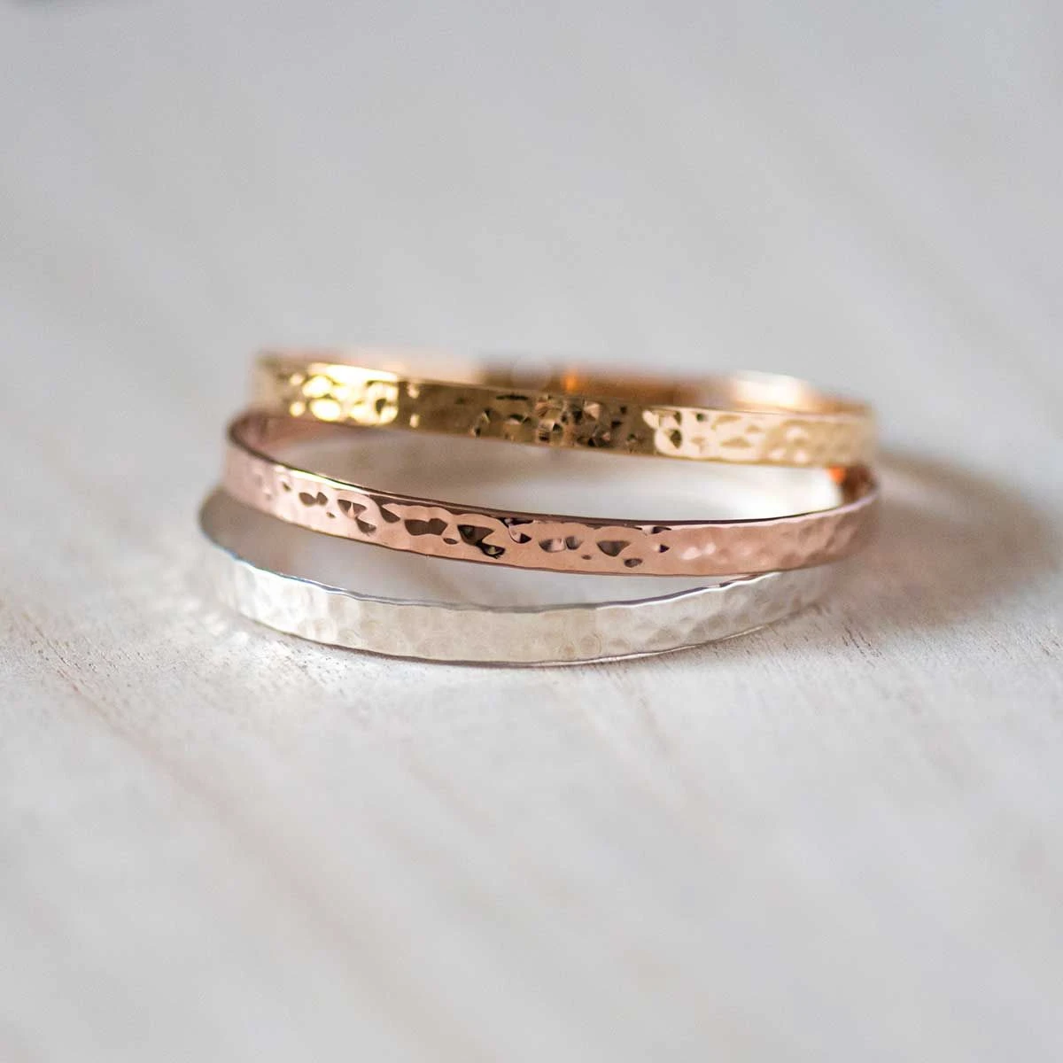 Le trio de joncs ruban fins martelés est un bijou ultra-chic qui vous permet de marier à la perfection l’argent, le plaqué or rose et le plaqué or jaune.
